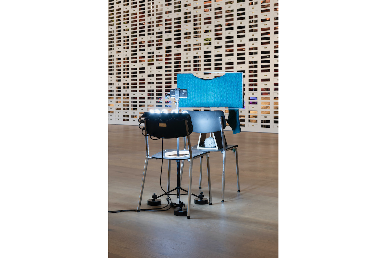 In addition to this sound, a stage made of floorwood from an abandoned factory in Basel, a stuffed animal that was also left in a warehouse, a video to show the contents of the refrigerator, and a huge photo of the theater seats, the number plates on the seats where silent recordings were made in each theater, etc. make up this work.